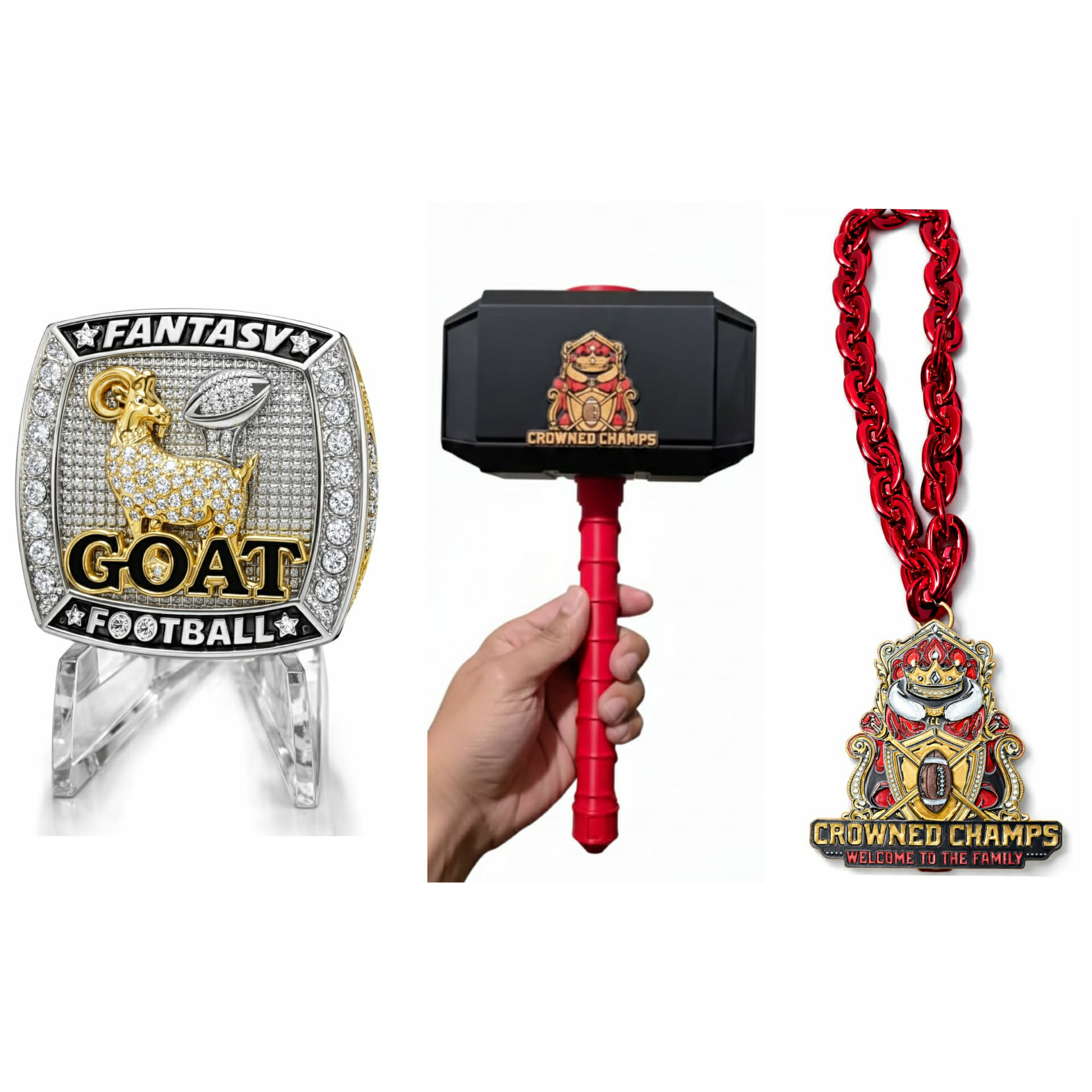 $24.99 month per person. Crown, Premium Case, Custom Championship Ring, Championship Belt, Custom Jersey, Custom Football, Royal Robe, Commissioner Hammer, Custom Bobblehead, Last Place Bum Punishment Game, Cameo Draft Order Reveal. Crowned Champs Fantasy Football Draft. $1000 winning thru LeagueSafe